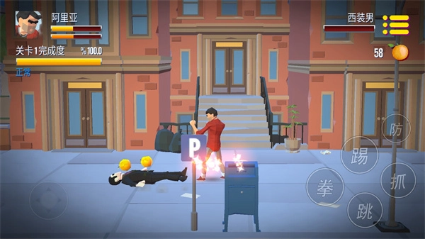键位设置很简单,左侧的虚拟摇杆负责控制方向,右侧则分布着独立的功能按钮,像踢、拳、抓、跳、防这些动作都有对应的单独按键,这样的布局能让玩家操作起来更顺手。