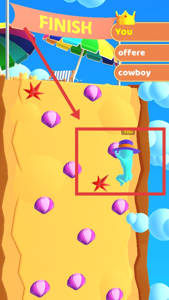 首先进入游戏,操控角色在沙滩上攀爬,避开障碍物,收集道具,尽力向上攀登以在竞赛中占据优势,开启沙滩攀爬的挑战。