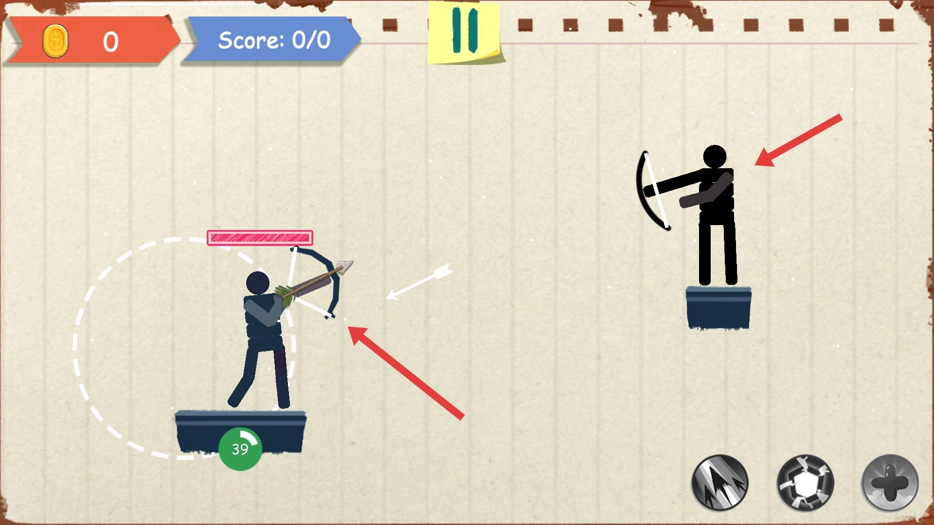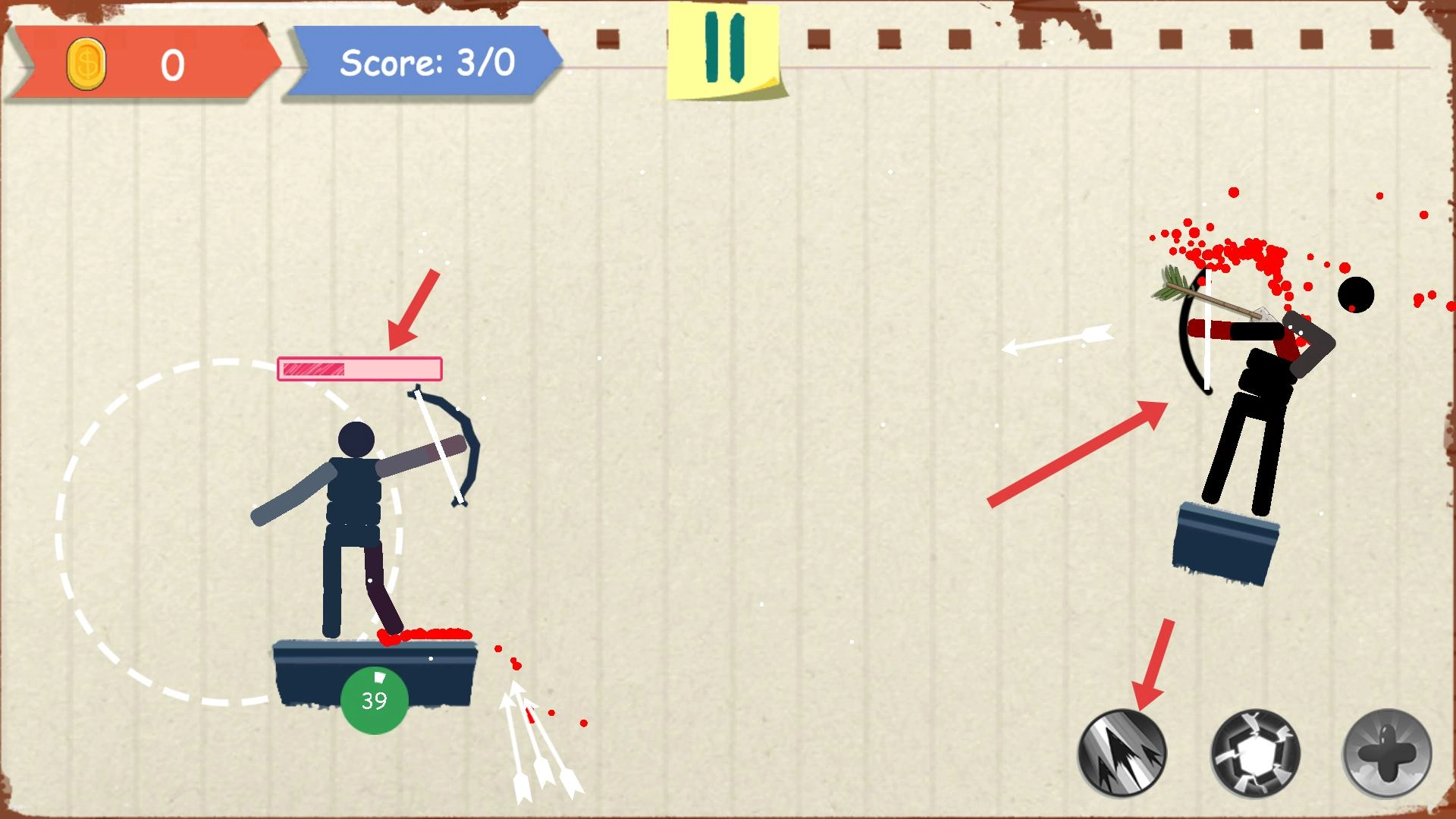 战斗时留意敌方火柴人的位置,等己方蓄力完毕,找准时机点击发射,让箭矢准确命中对手,与此同时还要注意避开敌方射来的箭。