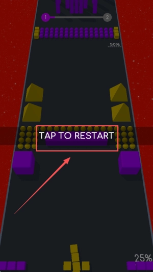 要是进度卡在50%或者25%,点击「TAP TO RESTART」就能立刻开启新局,反复循环直到进度突破100%就算过关。