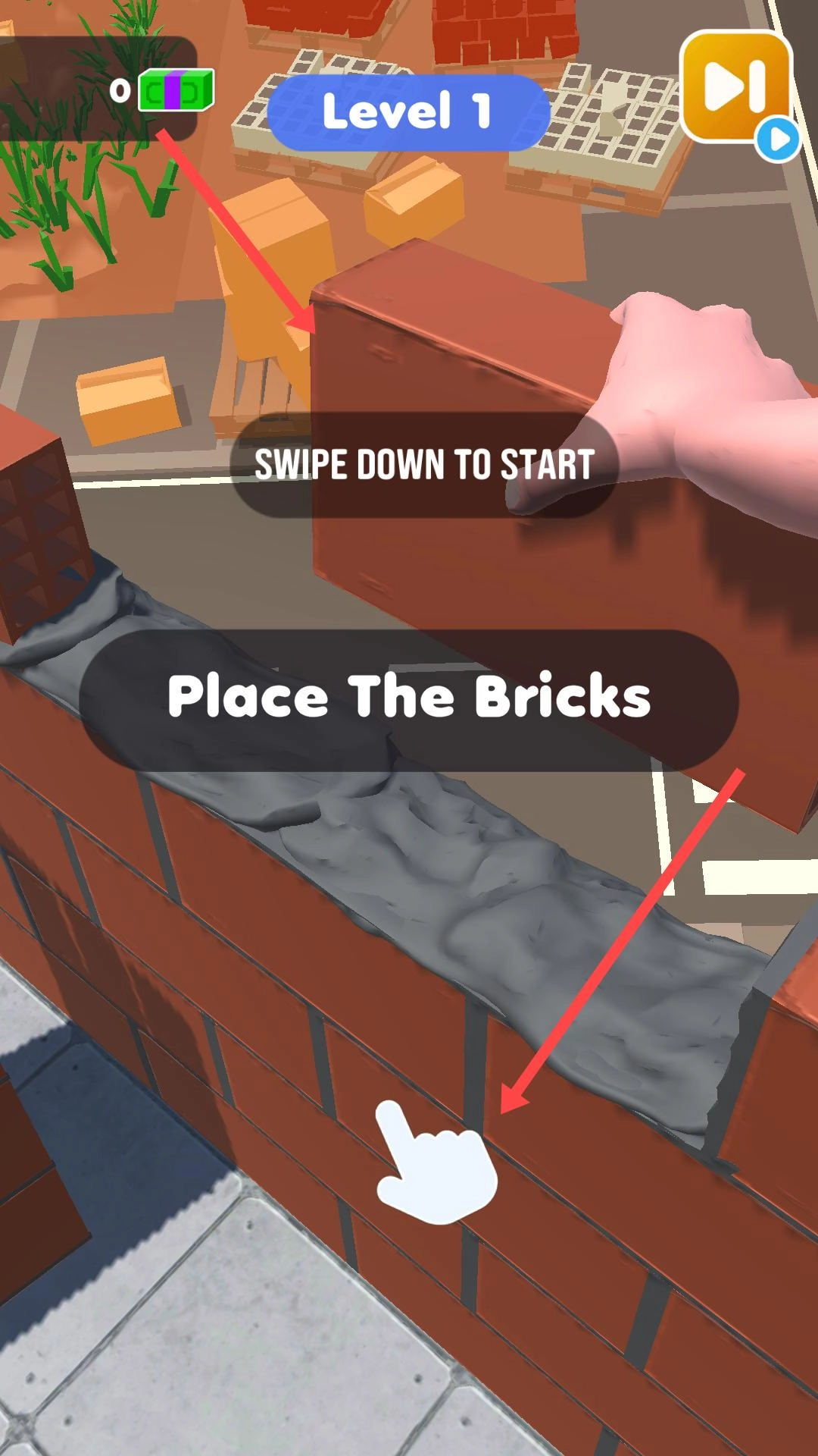按照提示向下滑动来放置砖块,对准水泥的位置进行精准操作,一步步垒砌砖墙,完成基础建造任务,以此提升操作的熟练度。