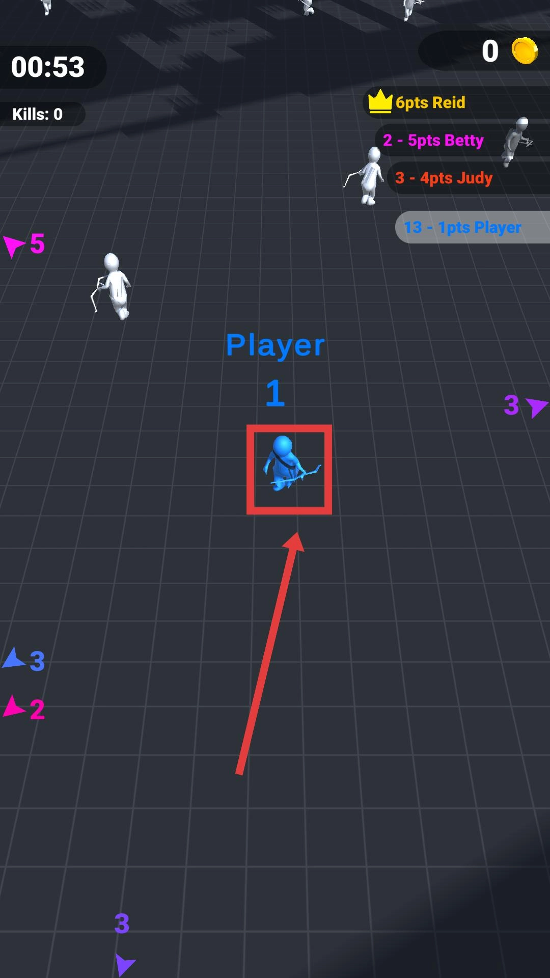 战斗过程中,操控蓝色玩家在网格场景内移动,避开高等级碰撞,依照箭头指示的方向行动,优先对附近的敌人发起攻击,积累击杀数量。