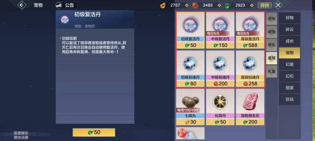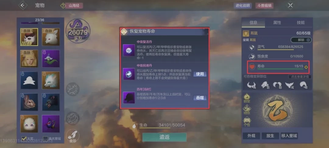 宠物设有寿命机制,每次死亡会扣除1点寿命值,一旦寿命值降至0,该宠物将无法被召唤参与战斗。玩家可通过让宠物吞噬百年、千年、万年或更高级别的临时宠物,来恢复其寿命。