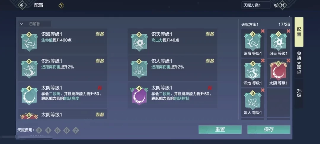等级每提升一级,就能得到1点星宿点。这时可以先解锁星宿里的【识海】【识天】【识地】【识人】,强化自身基础能力,同时解锁对应的星宿天赋。后续个人比较建议解锁【中天之星-太阴】的技能,开启二段跳、三段跳后,角色行动会更灵活。各位旅者也能依据自身需求挑选其他星宿来解锁。