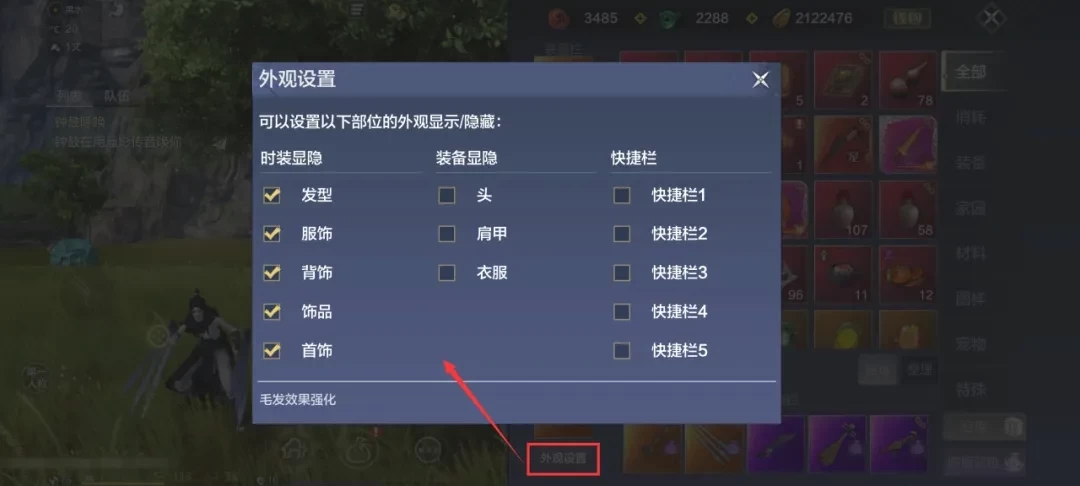 打开背包后,在【外观设置】里能够对时装、装备以及快捷栏的显示或隐藏进行调整。要是对当前的形象效果不满意,就可以在这里将其隐藏,这并不会影响时装和装备本身效果的正常生效。