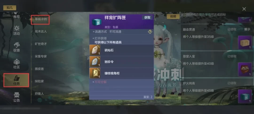 【福利-任务】板块设有一系列任务,大家尤其要重视等级冲刺任务,完成它能拿到不少实用奖励,像48格仓库扩容、星宿养成材料、种植资源大礼包以及橙色品质的锁灵弓等。