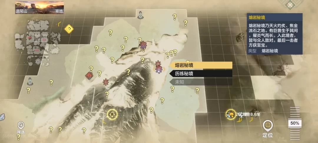 游戏内的秘境分为历练秘境、熔岩秘境和混沌秘境三种。其中,历练秘境与熔岩秘境能够产出灵气(即大荒经验),混沌秘境则可获取混沌之气(也就是混沌经验)。而此处所提及的秘境,正是【历练秘境】。