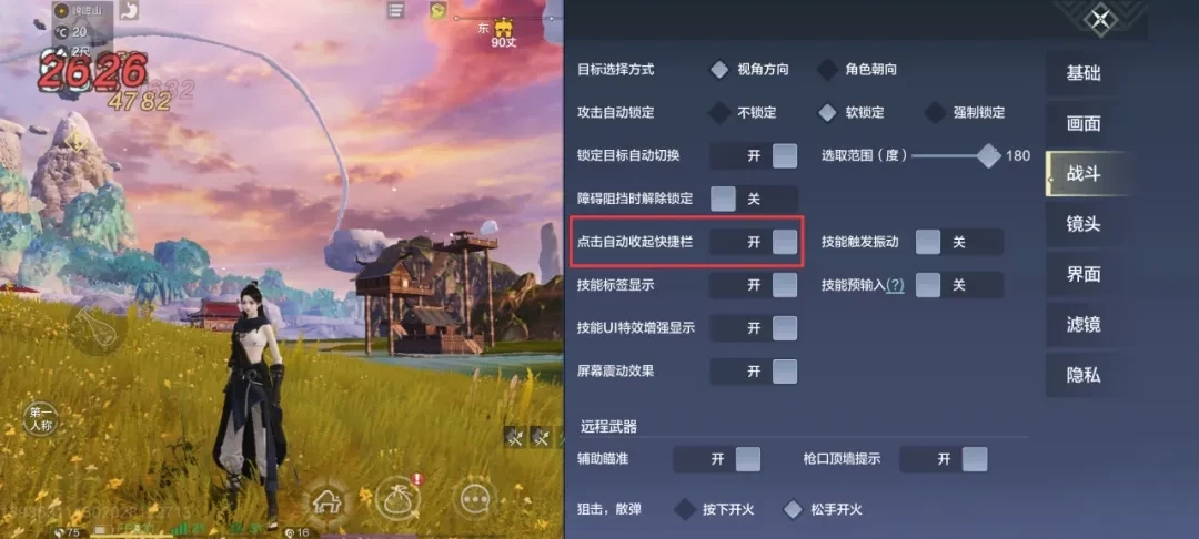 打开游戏主界面右上角的【玩法页面】,进入设置界面后,就能调整游戏画面、战斗相关设定、UI风格,还可以自定义界面图标的位置、大小与透明度,以及画面的色彩风格等。其中,“切换武器自动收起快捷栏”和“骑乘键位置”这两项设置建议重点调整,能让操作体验更加顺手。