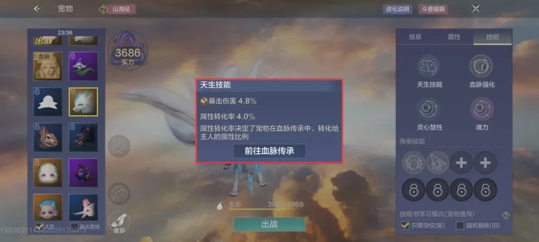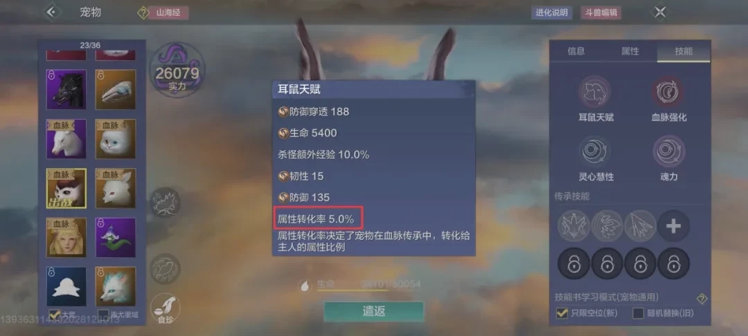 在《妄想山海》里,宠物的天赋与血脉各有差异,其中血脉属性是角色属性提升的核心来源。普通宠物的血脉属性转化率为4%,进化兽则能达到5%。因此,培养时可优先考虑进化兽——尽管普通宠物能通过吞噬无限血蛋来提升转化率,但在游戏初期资源有限的情况下,进化兽无论是自身强度还是血脉属性加成,都是更优的首选。