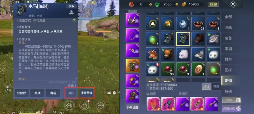 批量吞噬功能仅适用于非变异的临时宠物。操作时,您可点击背包中的普通临时宠,随后选择【更多-批量吞噬】选项即可。