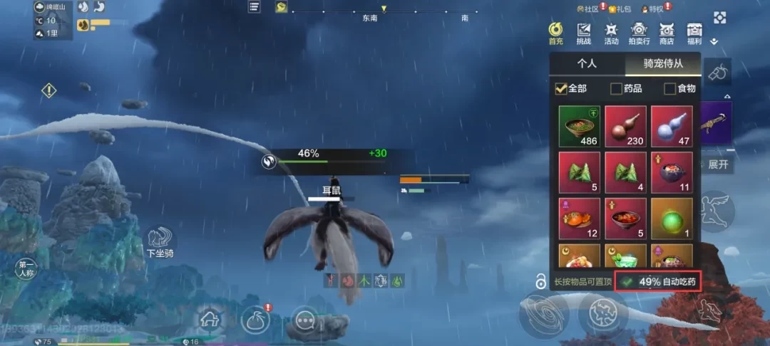 在给宠物喂食时,能够批量投喂经验丹、食物以及化育丹;而在宠物喂食的快捷面板里,不仅可以锁定该面板,还能通过长按食物或药品来将其置顶,同时也能够自行设置当宠物血量低于某个数值时自动服用药品。