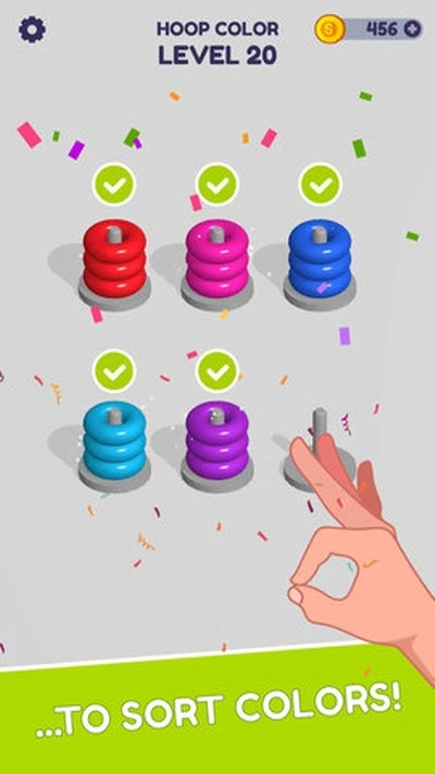 快乐叠圈圈是一款轻松有趣的闯关类手指游戏,玩家需要通过调整立柱上的圈圈,让相同颜色的圈圈都归到同一根立柱上。这个游戏很考验逻辑思维和解谜思路,玩家得巧妙利用场景里多余的立柱来周转,把同色的圈合理地汇集在一起。