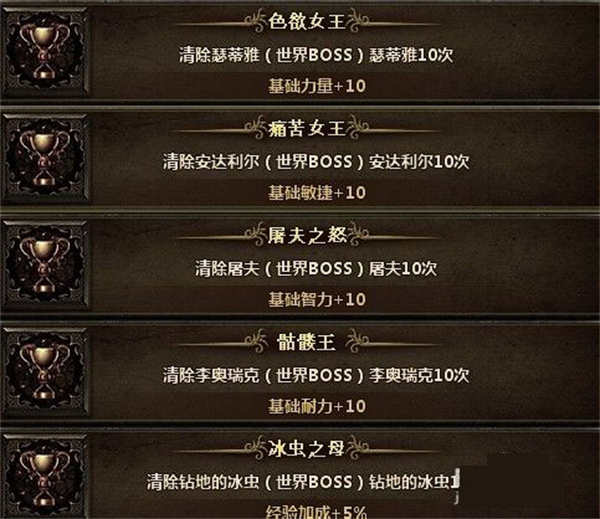 最后要提到的是击杀BOSS类成就、头颅成就以及装备强化成就。