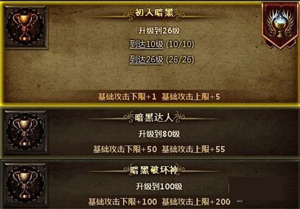 升级类成就共有三个,对应的达成条件分别是角色等级达到26级、80级和100级。