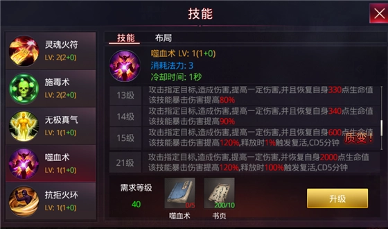 首先,噬血术算得上是道士技能里单体伤害最突出的技能,因此在首次攻沙之前,我们可以优先将噬血术提升至15级,这时就能触发百分之一的复活效果。