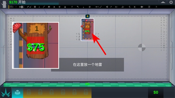 进入布置阶段后,点击下方道具栏里的地雷选项,把它放在指定区域,合理运用道具来完成测试任务,与此同时要留意当前的资金数值。