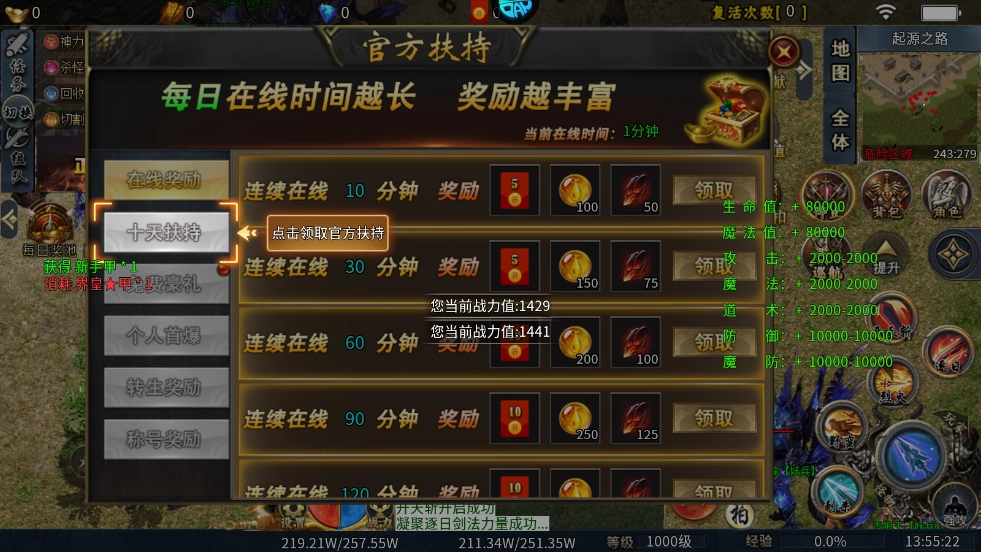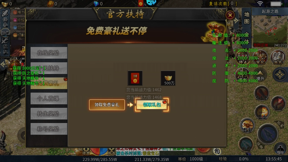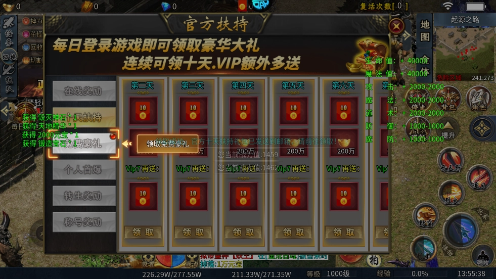 1、玩家登录游戏就能领取丰厚福利,涵盖多种地图、专属神器、加速装备、鞭尸神器、炫酷光柱、免费礼包等内容,助力玩家在游戏初期就拥有优质的体验。