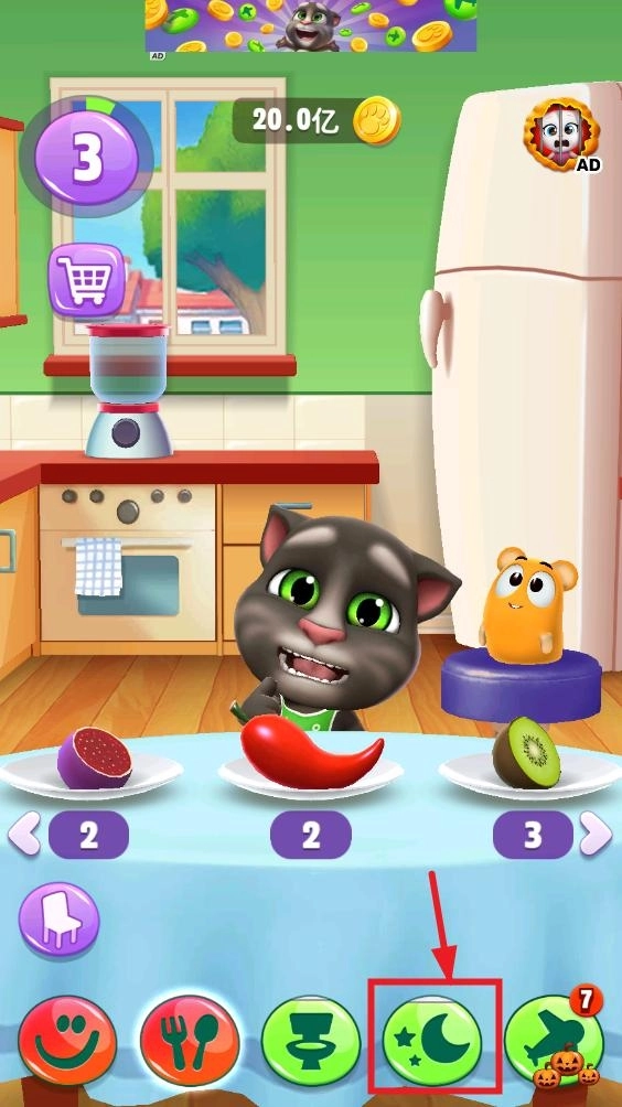 2、下方的图标代表着汤姆猫当前的状态,从这里能看到月亮图标已经快空了,说明我们得让它去睡觉了。
