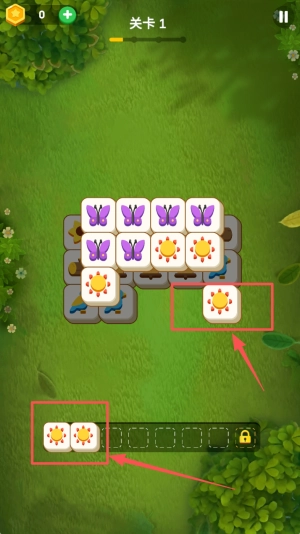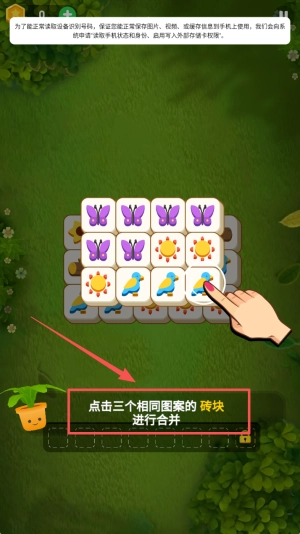 看到屏幕上带有各种图案的方块后,根据提示点击三个图案相同的砖块——比如三只蝴蝶或者三个太阳,它们就会合并并消除。