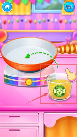根据绿色箭头的指示,点击量杯,把里面的黄色液体倒进锅里进行烹饪。