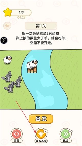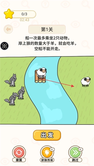 现在进入第一关,请先熟悉关卡规则:船只每次最多只能搭载两只动物;若岸上狼的数量超过羊,羊就会被狼吃掉;空船无法启动航行;另外要留意屏幕上方的星星进度条和倒计时显示。