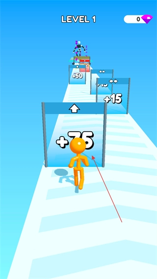 进入游戏的第一关LEVEL1,你需要操控小人在跑道上前进,通过那些带有+数值的门,这样就能增加自身的数值了。