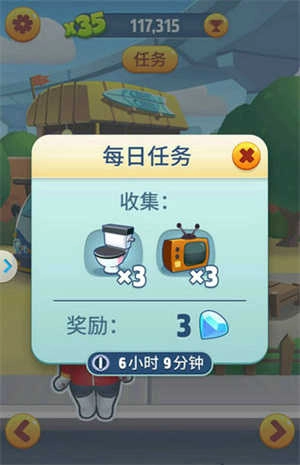 “日常”玩法是不少MMORPG的常规配置,一般需要玩家每日重复完成固定目标,以此换取经验、货币、道具等奖励。而《汤姆猫跑酷》的“每日任务”玩法却很有特色:一方面,玩家每天接到的任务各有不同,根据观察,任务大致涵盖收集物品、积累分数、拾取道具、限时存活、固定路线跑酷等类型;另一方面,玩家完成目标后获得的奖励也并非一成不变,金条、钻石、炸药会和任务随机搭配,看来游戏后续或许还会把角色强化物品纳入奖励范畴。不得不说,《汤姆猫跑酷》每日任务的趣味性和新鲜感比传统日常高出不少,笔者试玩了几天,完全没有产生厌倦感,反倒对每天的任务内容充满了期待。