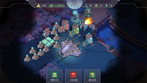 战斗时点击下方的卡牌,就能召唤部队、释放技能;一旦消灭所有敌人,便会进入白天阶段,为下一波防守做准备。
