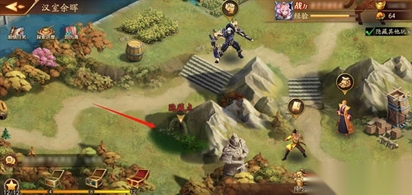 本章的隐藏点属于线索事件,必须先获取线索才能触发。线索在地图上方的山脚下,你需要拾取那里散落的纸页,然后按照纸页上的指示前往地图左下方貂蝉右侧石阶旁边的山脉,这样就能触发隐藏点了。
