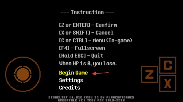 在操作说明界面,先熟悉各个按键的功能,像【Z】或【ENTER】是确认键、【X】或【SHIFT】是取消键之类的,之后点击【BeginGame】就能启动游戏了。