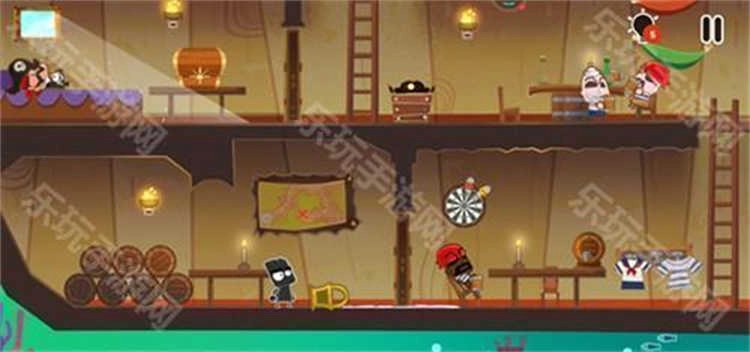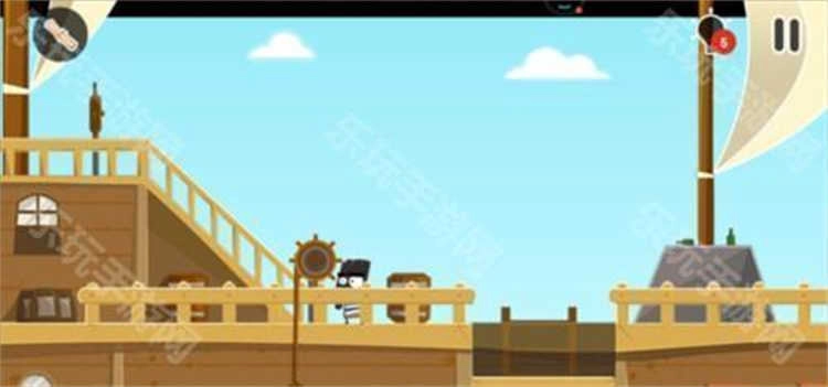 留意甲板上巡逻的海盗,等他转过身去时快速登上甲板,点击左侧的滑轮跳上汽艇就能通关了。