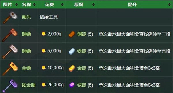玩家能够借助锄头进行挖土和耕种操作。当锄头完成升级后,长按左键进行蓄力,就能一次性锄好一片土地,锄地范围的大小由锄头的等级高低以及蓄力时间的长短共同决定。此外,锄头还可用于挖掘远古斑点,进而获取隐藏其中的物品。