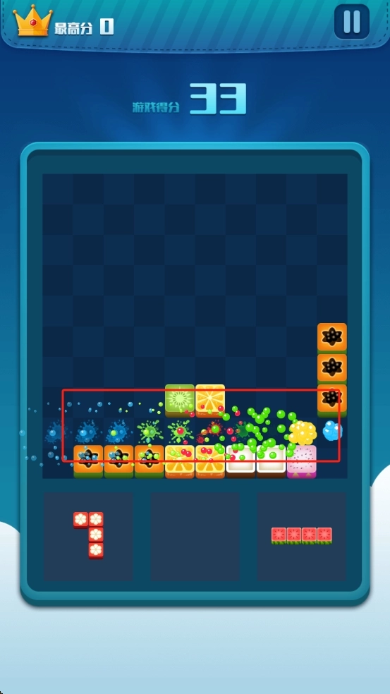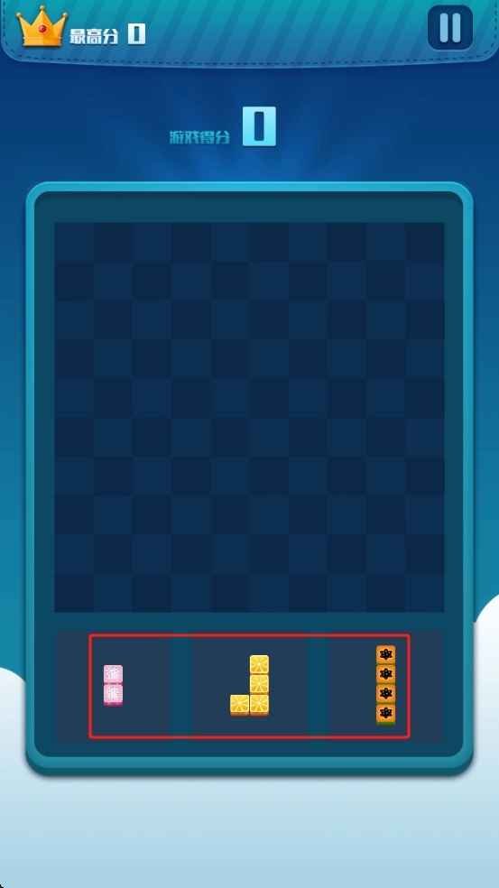 在游戏的初始界面里,你可以找到底部的粉色、黄色和橙色方块,把它们拖动到棋盘当中,通过构建能够消除的布局,来开启游戏的进程。