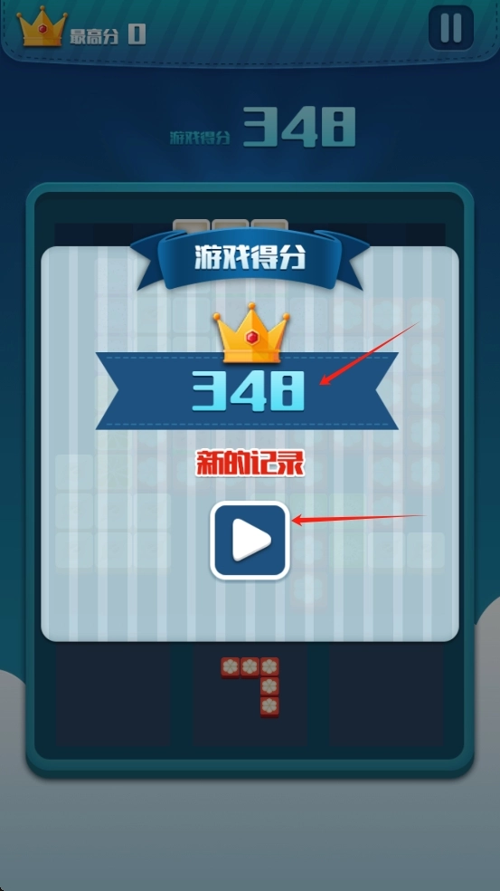 游戏结束后的结算界面呈现出348分的新记录,点击播放按钮即可重新挑战以冲击更高分数,继续沿用方块消除的玩法。