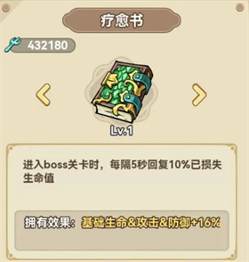 接下来是书本板块,我们向大家推荐疗愈书。在进入BOSS关卡后,它能每隔5秒按已损失生命值的百分比进行回复,助力战士在与BOSS对抗的过程中维持安全的血线,从而增强战场的反击能力。