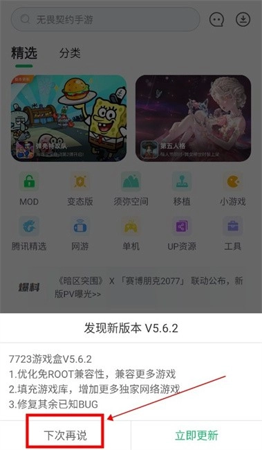 由于该4.5.2版本是旧版本,所以打开7723游戏盒后会弹出更新提示,点击【下次再说】按钮就能跳过此次更新。
