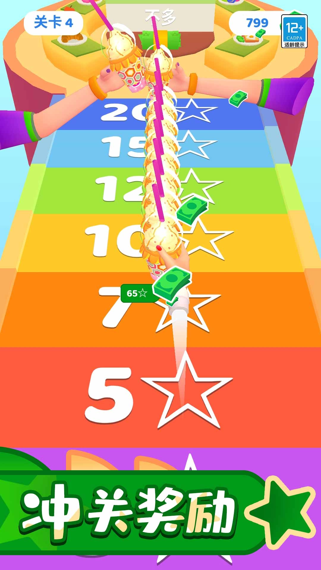 滑动屏幕来操控手部移动,在赛道上接住杯子;当路过糖浆、奶油等配料区时,配料会自动添加,从而让奶茶的口味和种类更加丰富多样。