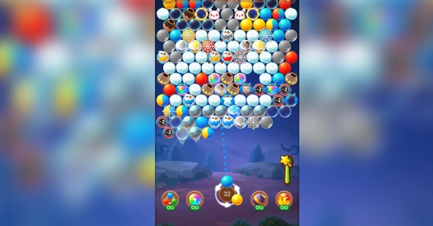 能替换成任意颜色,让玩家轻松达成消除效果,还能清除周围一片区域的泡泡,很适合处理泡泡密集的布局。
