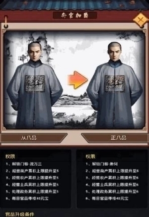 3、官阶晋升与策略成长:玩家可借助完成任务与参与战斗来提升自身官阶,解锁更多专属特权与特色玩法,亲身感受从底层小吏逐步成长为权倾朝野的权臣的完整历程。