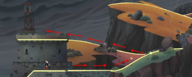 接下来,玩家要把路连通起来。首先得走到左边的灯塔那里,接着把右侧的路连通好,之后再点击前方,让老人继续往前走。