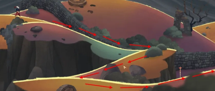 在关卡进程里,老人会遭遇新的障碍——围墙。玩家得操控一个滚动的轮子把围墙击碎,这样老人才能够顺利通过。具体操作是先调整道路,把黄色道路与铁塔下方的路连接起来,随后走到铁塔下面,再次调整道路,将黄色道路摆放妥当,接着一直向右行进。之后,把接下来的三条道路摆成Z字形,沿着这条Z字道路往前走,最终会在悬崖边上看到一栋废弃的破楼。操控老人走到土红色的道路上,再将破楼的山角向上抬起,松开手后滚轮就会顺着山体往下滑落,进而砸破下方的围墙,老人就能从那里通过了。