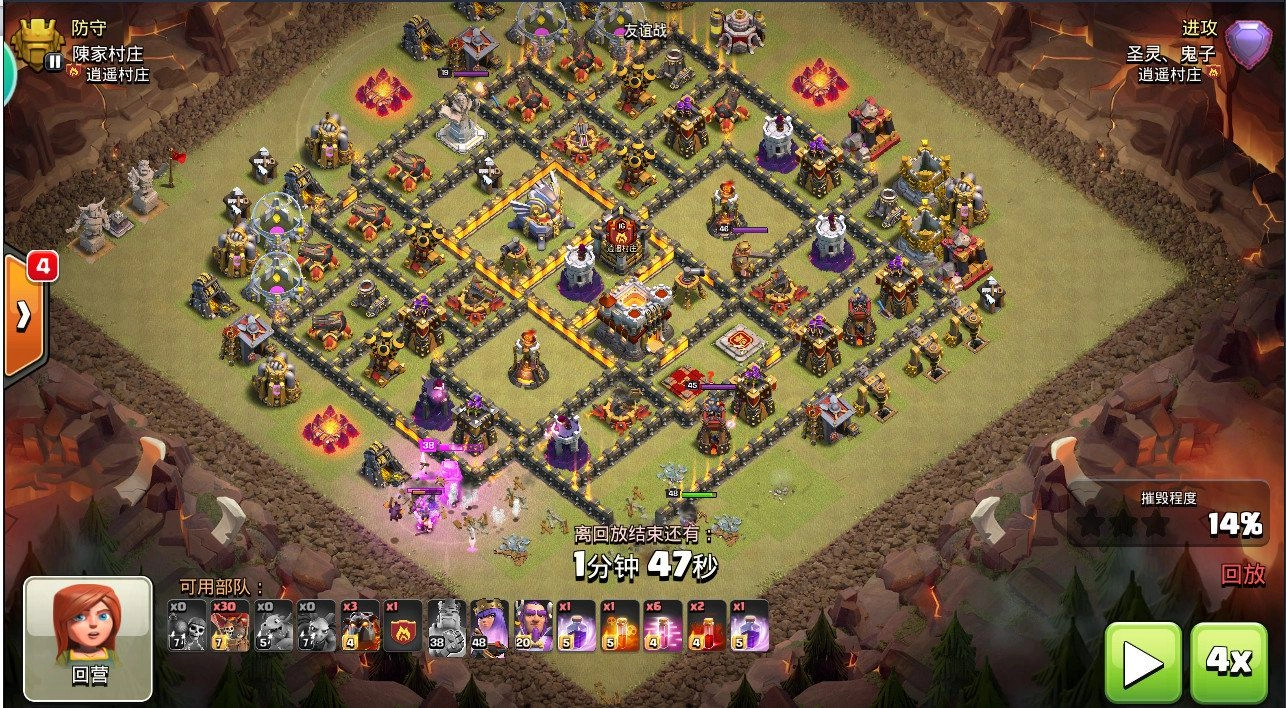 格子阵的应对方法:这类阵型的防御布局存在较大空隙,推荐采取“分段推进”的战术——先派遣女巫清除外围区域的防御设施,再利用狗球组合突破阵型核心地带。以“九宫格”阵型为例,可优先清理四个角落的防御建筑。