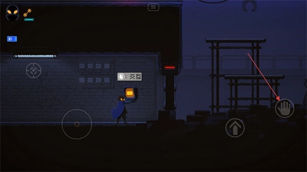 点击右下角的跳跃键,角色就能抓住上方的墙角;按动向上移动的方向键,即可进入狭小的隧道。