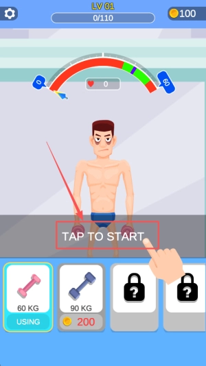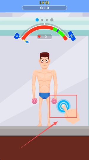 接下来,按照游戏给出的提示,用手指点击屏幕上的哑铃图标并拖动,以此来模拟举重的动作。