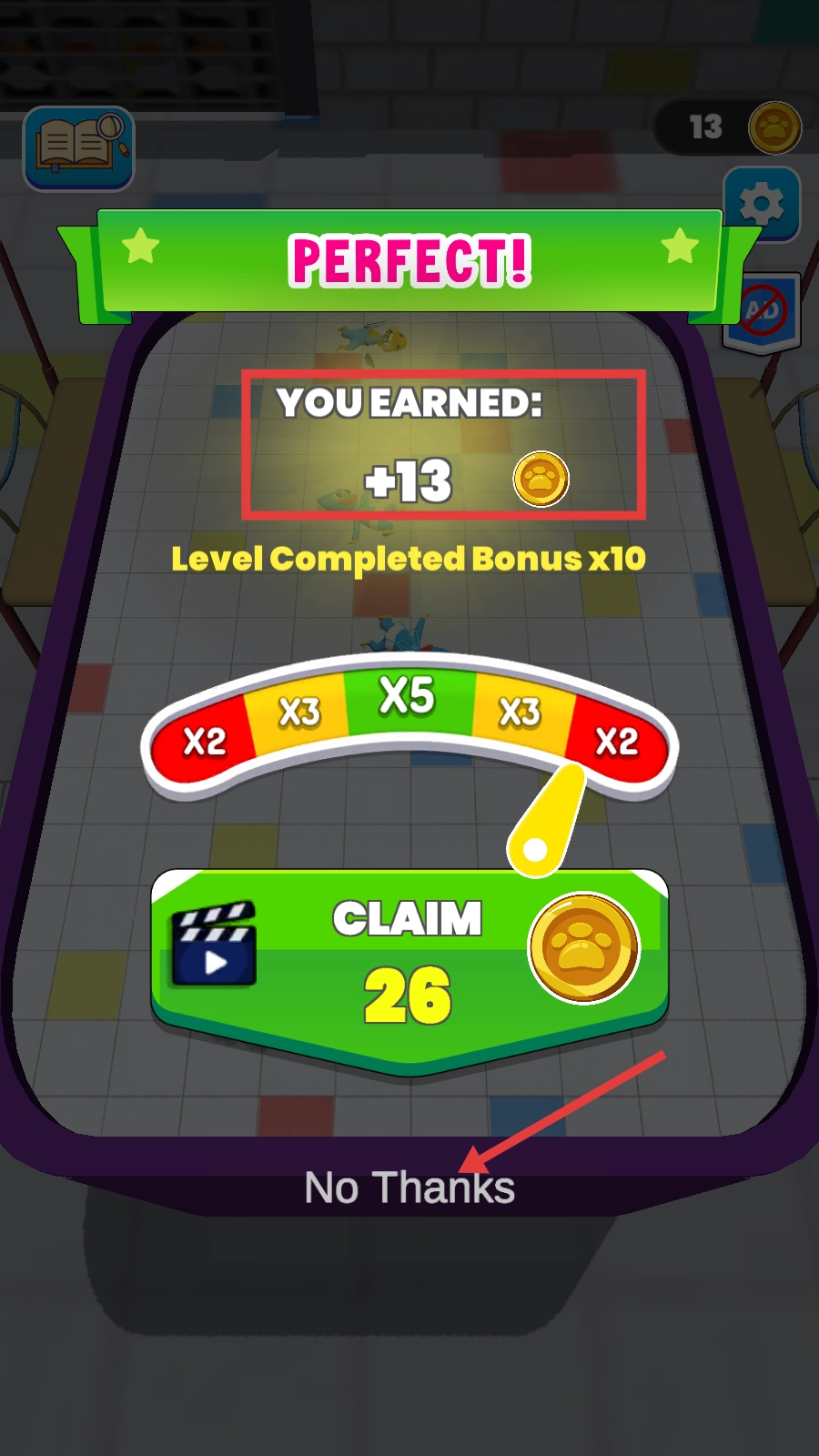 关卡完成后会获得【+13-金币】,点击【No-Thanks】即可结束当前关卡,为开启下一关做准备。