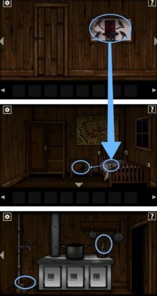 我们首先要做的第一步,就是按照提示点击床上那四个鸟的【骷髅头】,之后拿到床头柜里的【火柴】,接着进入厨房把【匕首】和【柴火】拿走。