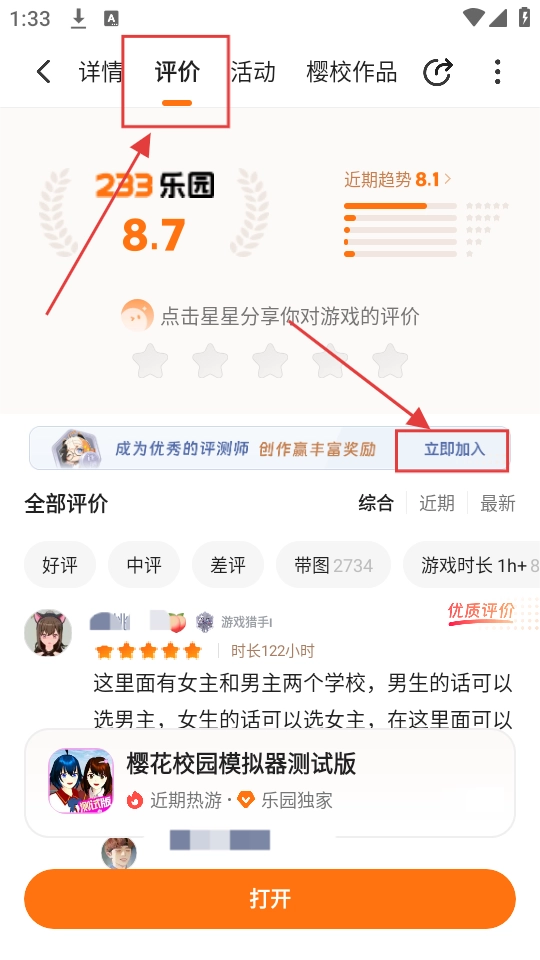 我们在游戏详情页面,点击【评价】标签,接着点击【立即加入】,就能申请成为评测师了。