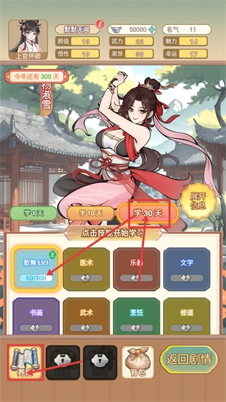 在养成界面选定【歌舞-LV1-60/100】技能后,选择【学30天】的学习选项,就能增加该技能的进度,帮助角色更好地养成。