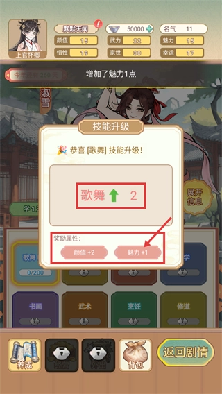 【歌舞】技能已提升到2级,得到了【颜值+2】【魅力+1】的属性加成,界面也同步显示魅力数值有所增长。