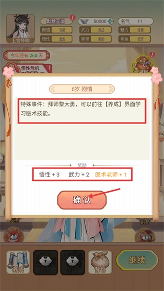 触发【6岁-剧情】特殊事件,拜黎大勇为师,领取【悟性+3】【武力+2】等奖励后,就能前往养成界面学习医术了。